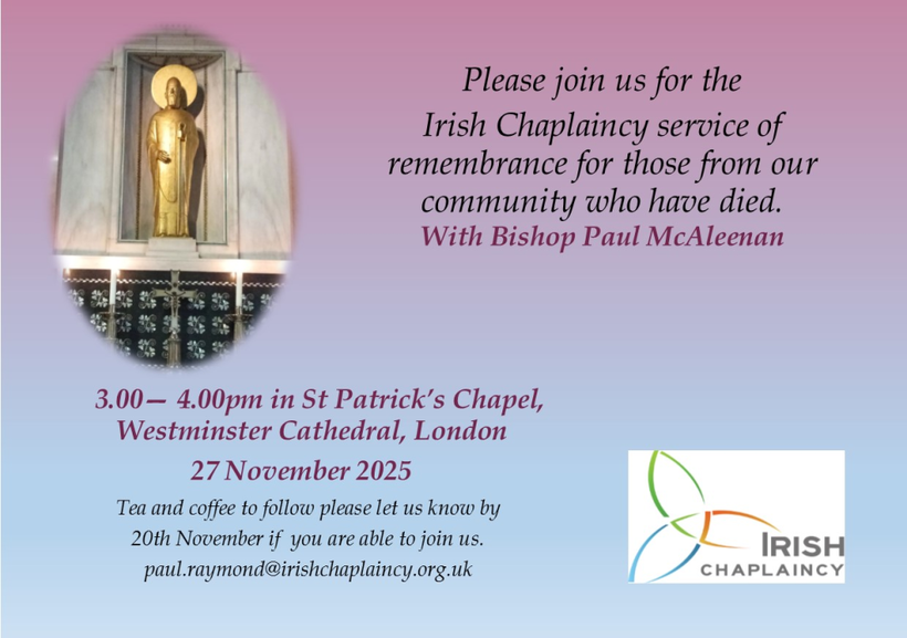 Every November the Irish Chaplaincy holds a service to remember clients, friends and supporters who have died in the past year. Save the date now and join us in Westminster Cathedral on Friday 8 November. If you plan to come please RSVP by 1 November to mahrukh.shabir@irishchaplaincy.org.uk